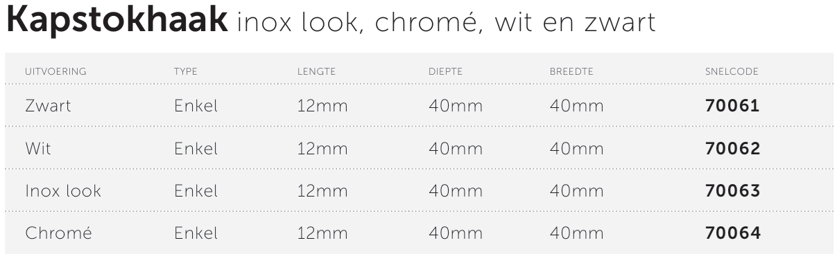Materiaal: Aluminium/ZamakAfwerking: Zwart, wit, inox look en Chromé