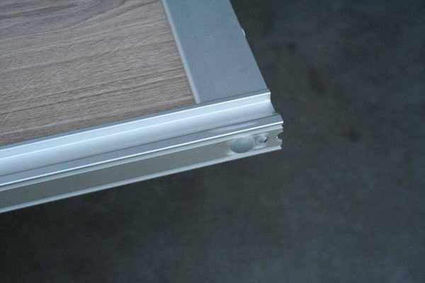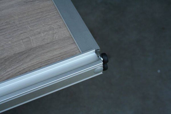 Aluminium systeem met gelagerde boven en onderwielen.